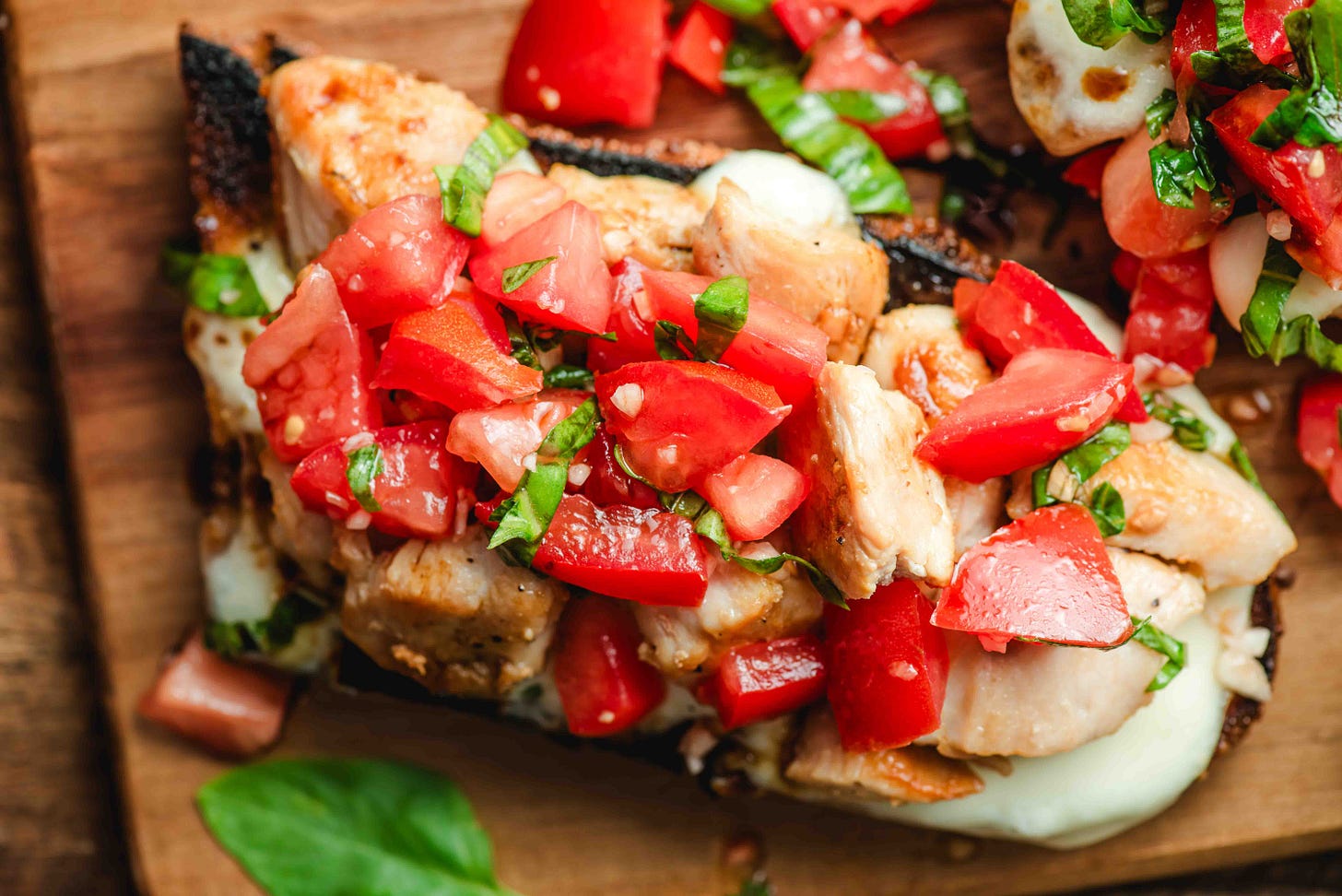 Garlicky grilled bread, melted mozzarella, chicken and basil tomatoes combine for a fresh, summery dinner.