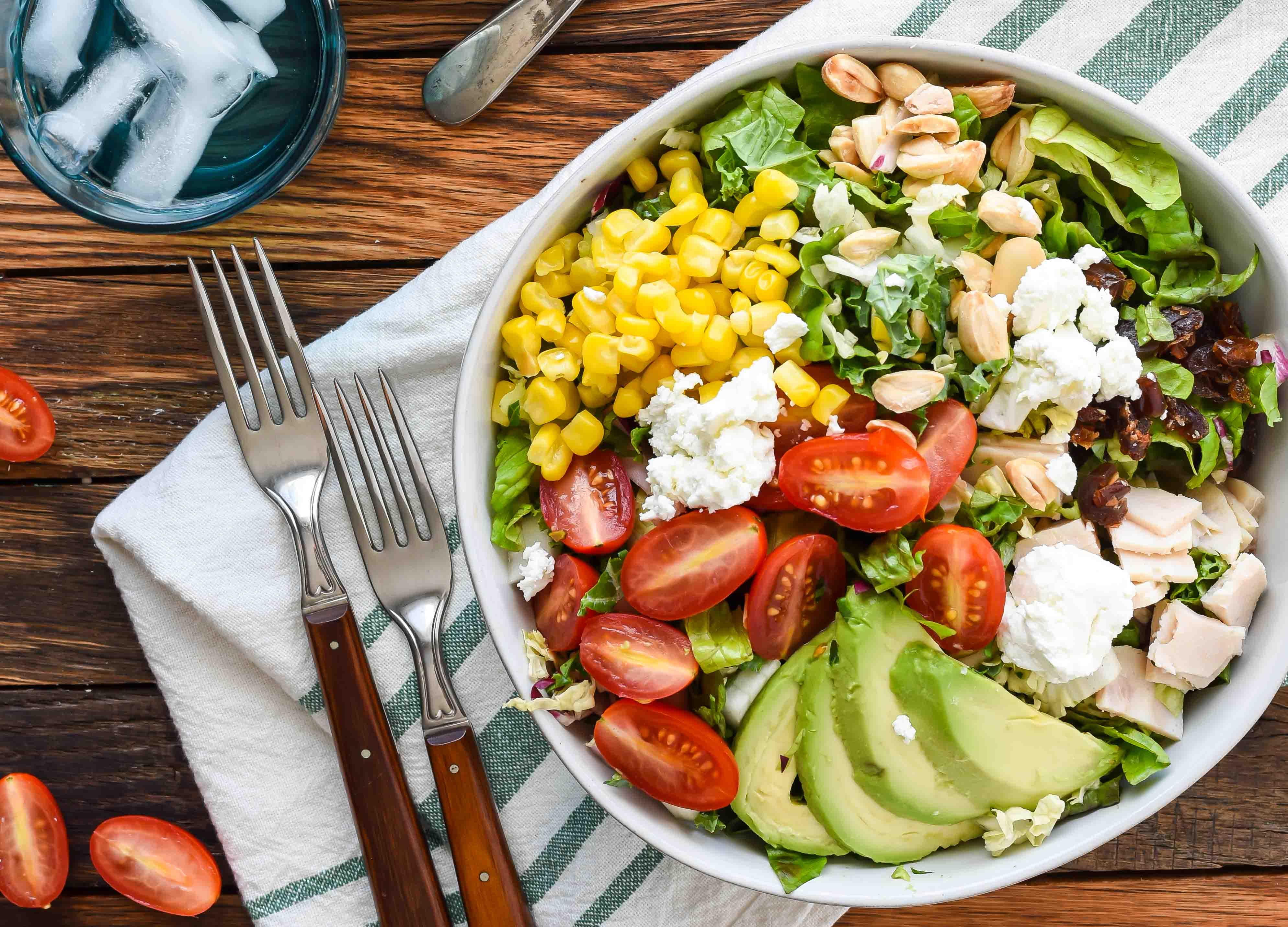 This is another restaurant copy cat that I had to figure out how to make at home to avoid going broke over a salad. It’s got ALL THE THINGS- creamy goat cheese and avocado, sweet dates and corn, crunchy nuts, and a killer vinaigrette. You can make it with deli turkey, but it’s even better with rotisserie chicken!