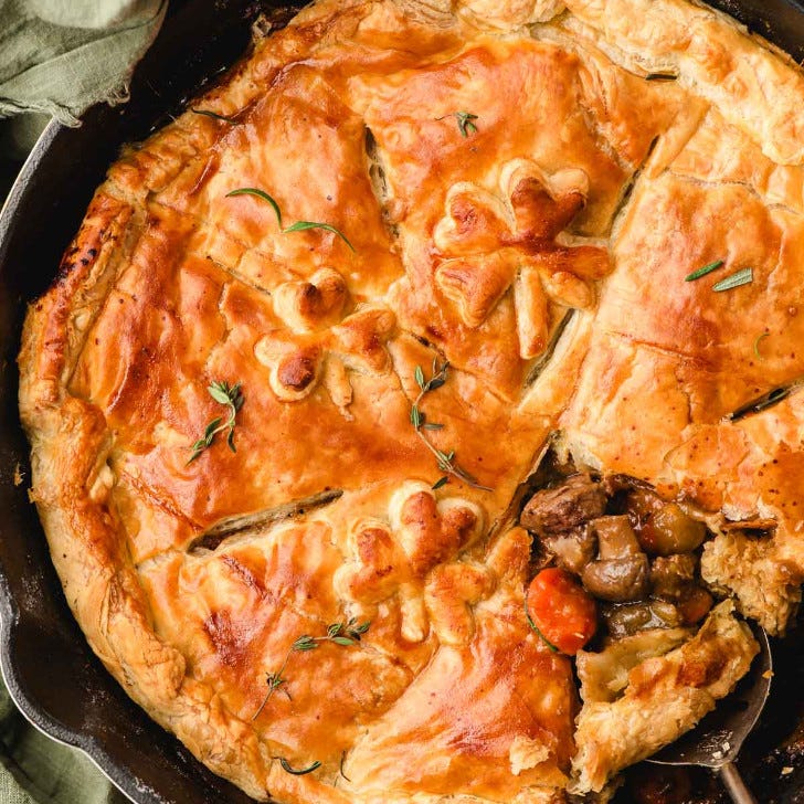 No worries here about a soggy bottom crust, because there isn’t any! We took the incredible beef stew recipe above, and topped it with an egg-washed freezer puff pastry for a pot pie that looks, sounds, and tastes AMAZING, but requires zero pie crust skills.