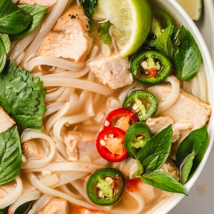 This comforting turkey soup (*you can use chicken) has wonderful broth and delicate rice noodles. But add the jalapenos and sriracha and the citrusy heat is sure to shock your nasal system back to life.