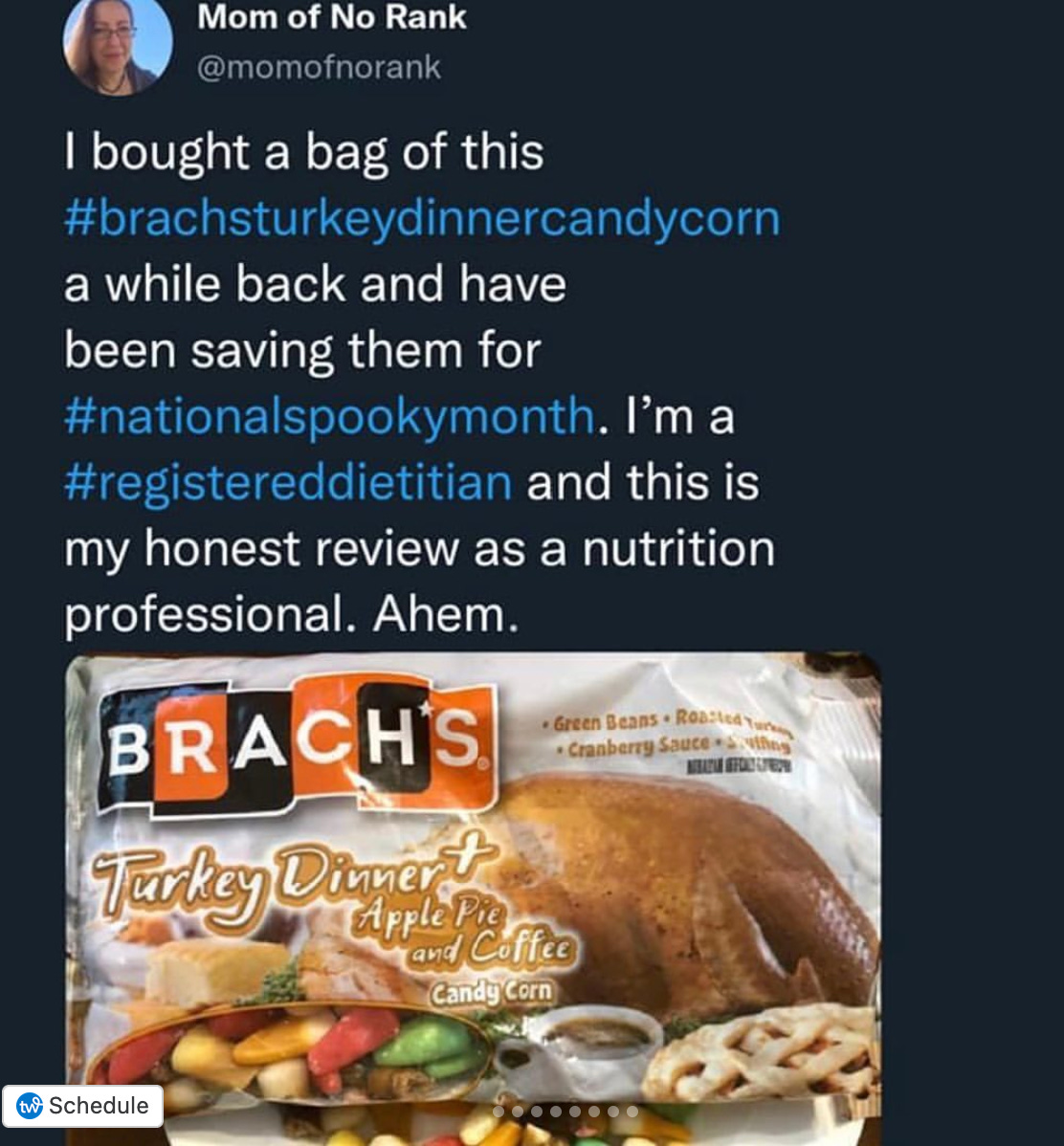 😆 This woman has done us all a service by taste testing each (horrifying) flavor of these Thanksgiving Dinner Candy Corns. My favorite line: “Top middle is stuffing. This one is an unrepentant violation of the Geneva Convention. Tastes like hate and sage.”