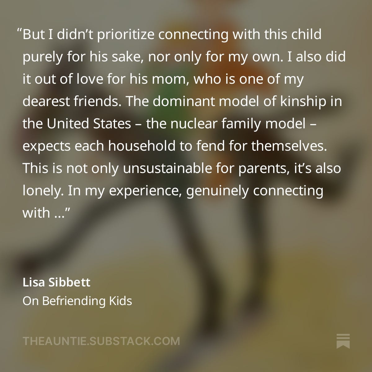 👧🏽 I felt so seen by this piece by Lisa Sibbett of the Auntie Bulletin. Whether you’re an aunt or a parent, I think you can appreciate both her tips for connecting with kids and WHY connecting with your own and other people’s children is so valuable.