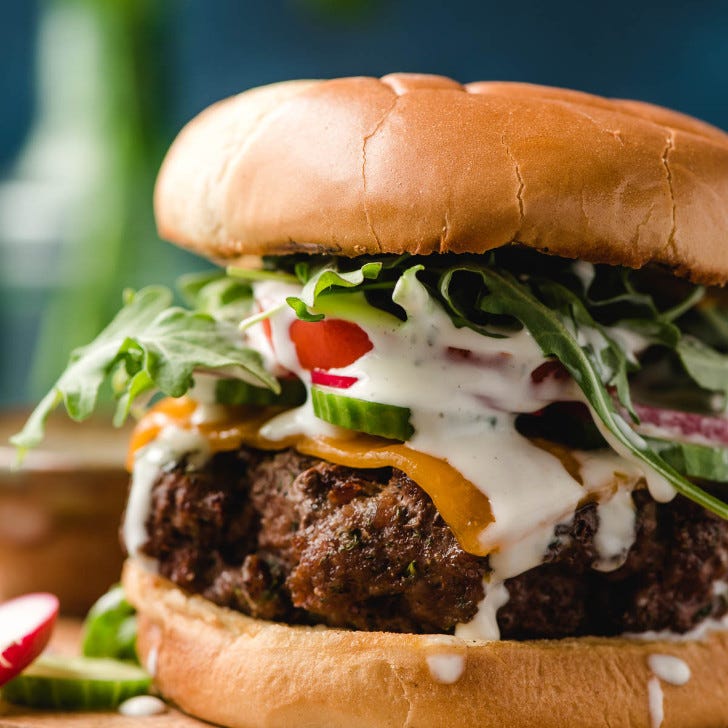 These cheesy burgers are seasoned with dried herbs like dill and parsley to give them that characteristic garden zing. But we also add a few crisp veggies and a drizzle of our favorite ranch dressing (from Jet’s Pizza) to make these burgers memorable.