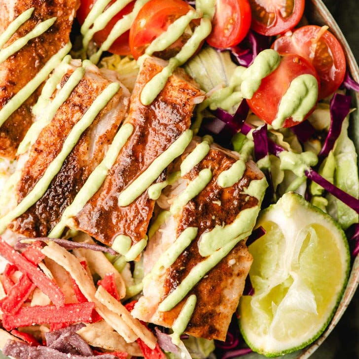 Fish Taco Salad Bowls combine flaky seasoned fish with shredded cabbage, lettuce, avocado dressing, and all your favorite taco toppings for a healthy and delicious meal.