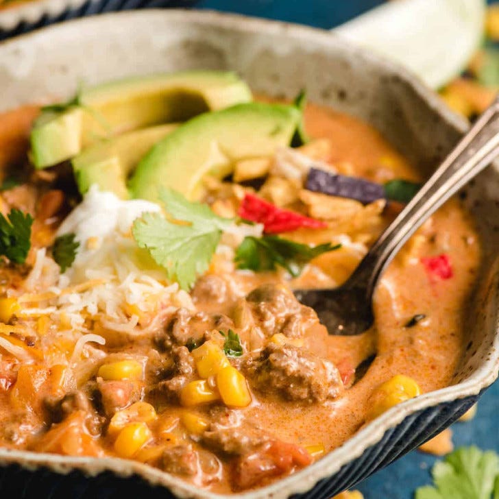 Taco night isn’t particularly difficult, it’s just that all those bowls of toppings makes for more dishes. Craving Mexican? Throw it all into one bowl with this easy 30 minute beef enchilada soup!