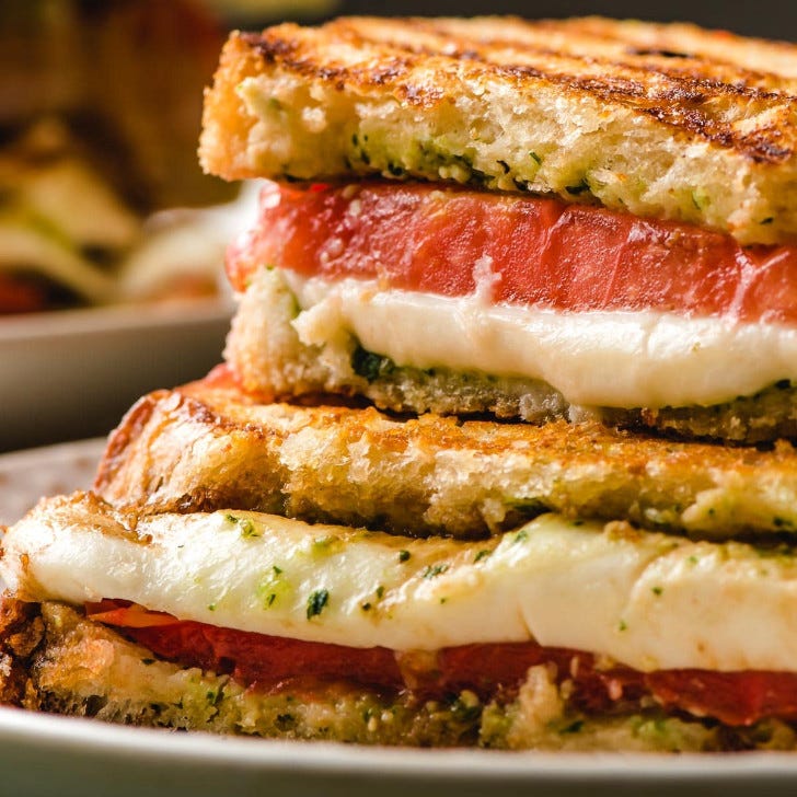 Crispy toasted edges, herby pesto and thick layers of tomato and mozz. It’s what all grilled cheeses want to be when they grow up.
