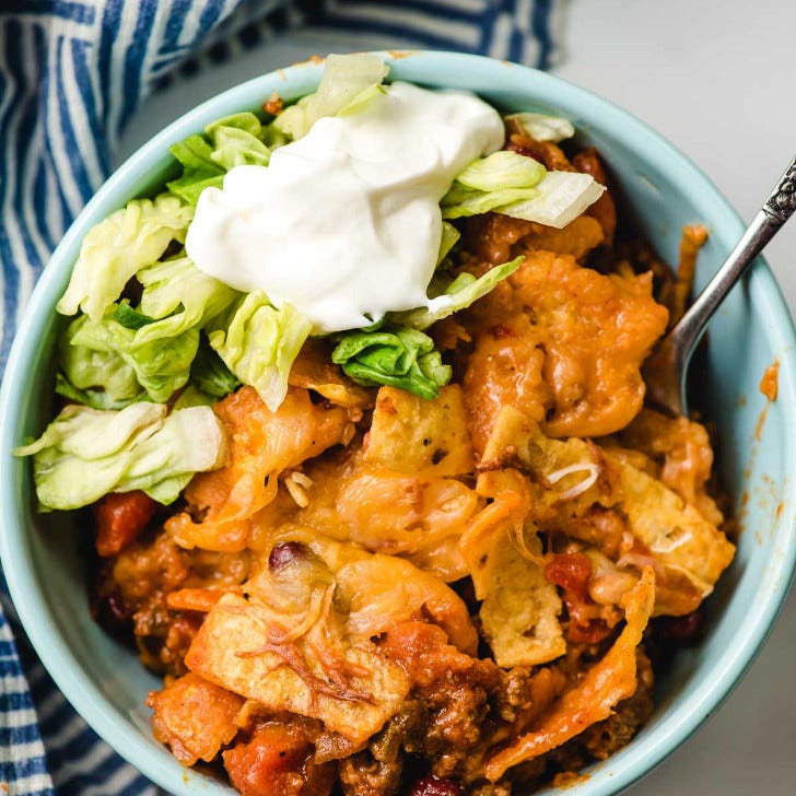 This is all the best parts of the taco-in-a-bag you might remember from your high school football games transformed into an easy to share casserole. Serve it with lots of fresh, crisp taco toppings.