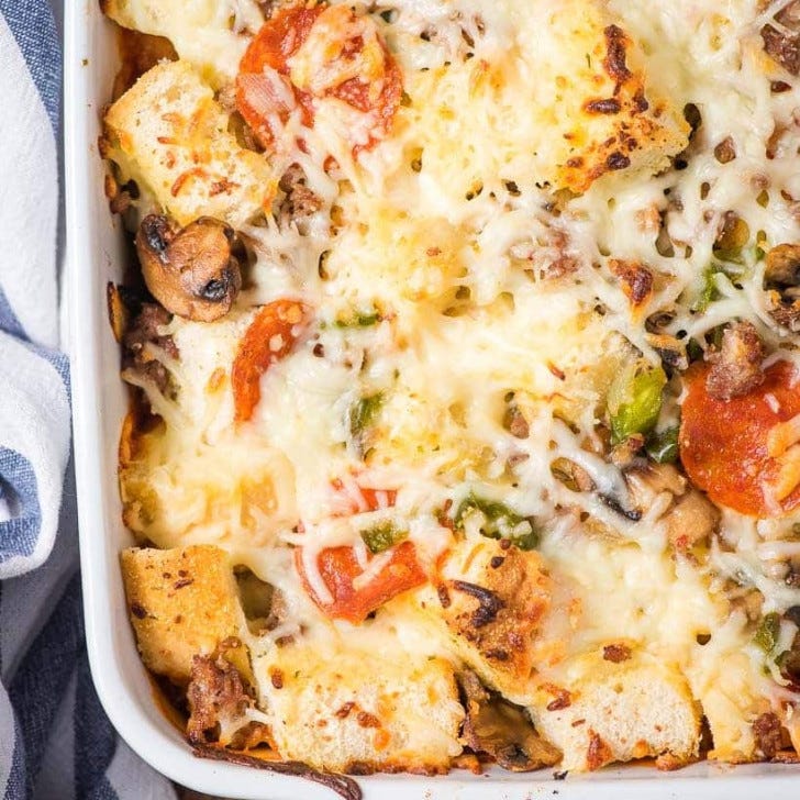 Cube up some day old bread and combine it with your favorite pizza toppings for a quick and family friendly casserole dinner.