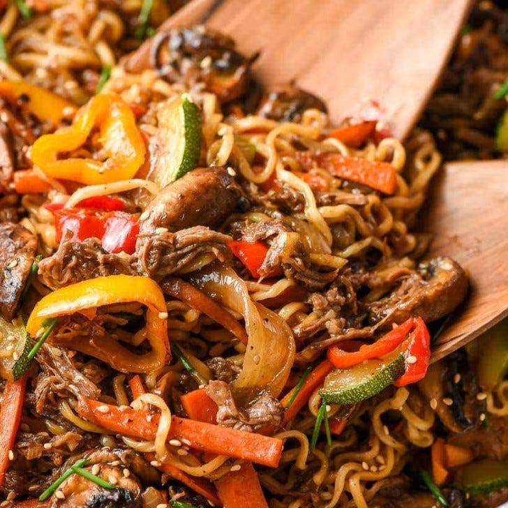 Next, we’re jazzing up those shredded beef leftovers with some stir fried veggies, and a sweet and savory ginger soy and rice vinegar sauce. A couple packages of ramen noodles make this delicious meal fun to slurp for the whole family.
