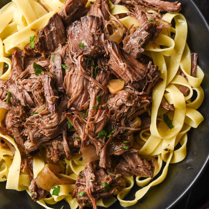 We’re starting our month with our favorite fall-apart tender roast. Though it’s fantastic on some egg noodles (as shown), we’re going with our favorite instant mashed potatoes, and saving the noodles for tomorrow night’s meal…