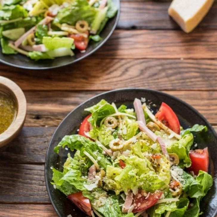 You can forget about the kids liking this one. But this isn’t for them any how. Just roll up some ham and cheese in a sandwich wrap for them, and make this salad for you. Using deli (or leftover) ham, slivers of swiss cheese, olives, and tomatoes, this salad recipe doesn’t rely on summer produce, so you can enjoy a crisp refreshing bite any time of the year. The real star of the show here is the homemade garlic vinaigrette.